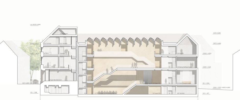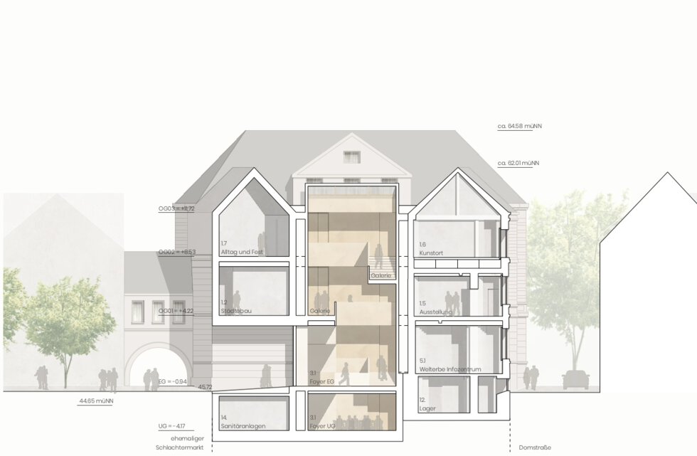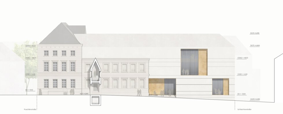 Der Neubau des Stadtgeschichtsmuseums geht mit einer Sanierung und Umnutzung der Bestandsgebäude an der Puschkinstrasse bzw. Domstrasse einher.