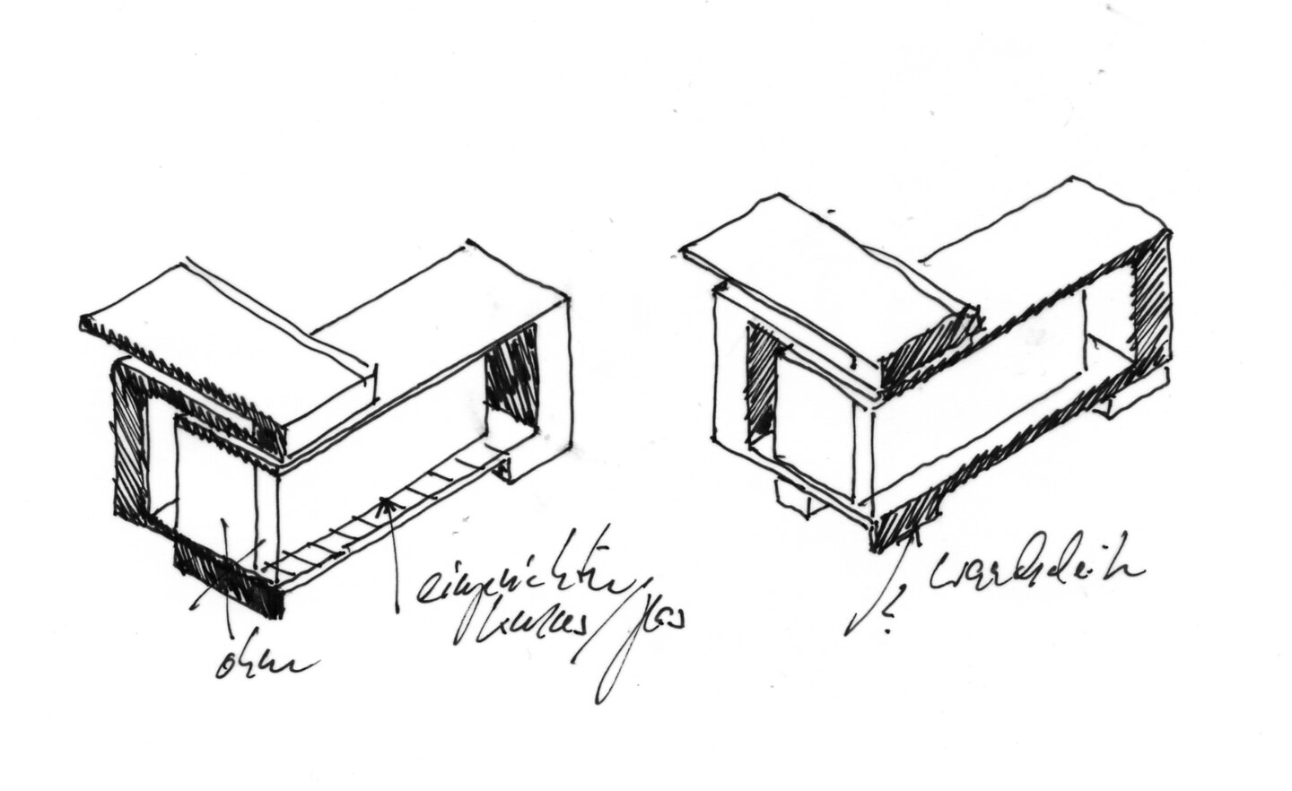Die Kopffigur schwebt über dem Riegel, der die Dachterrasse trägt. Alle Tragelemente sind statisch minimiert, sodass die filigrane Wirkung dieser leichten Architektur gesteigert wird.