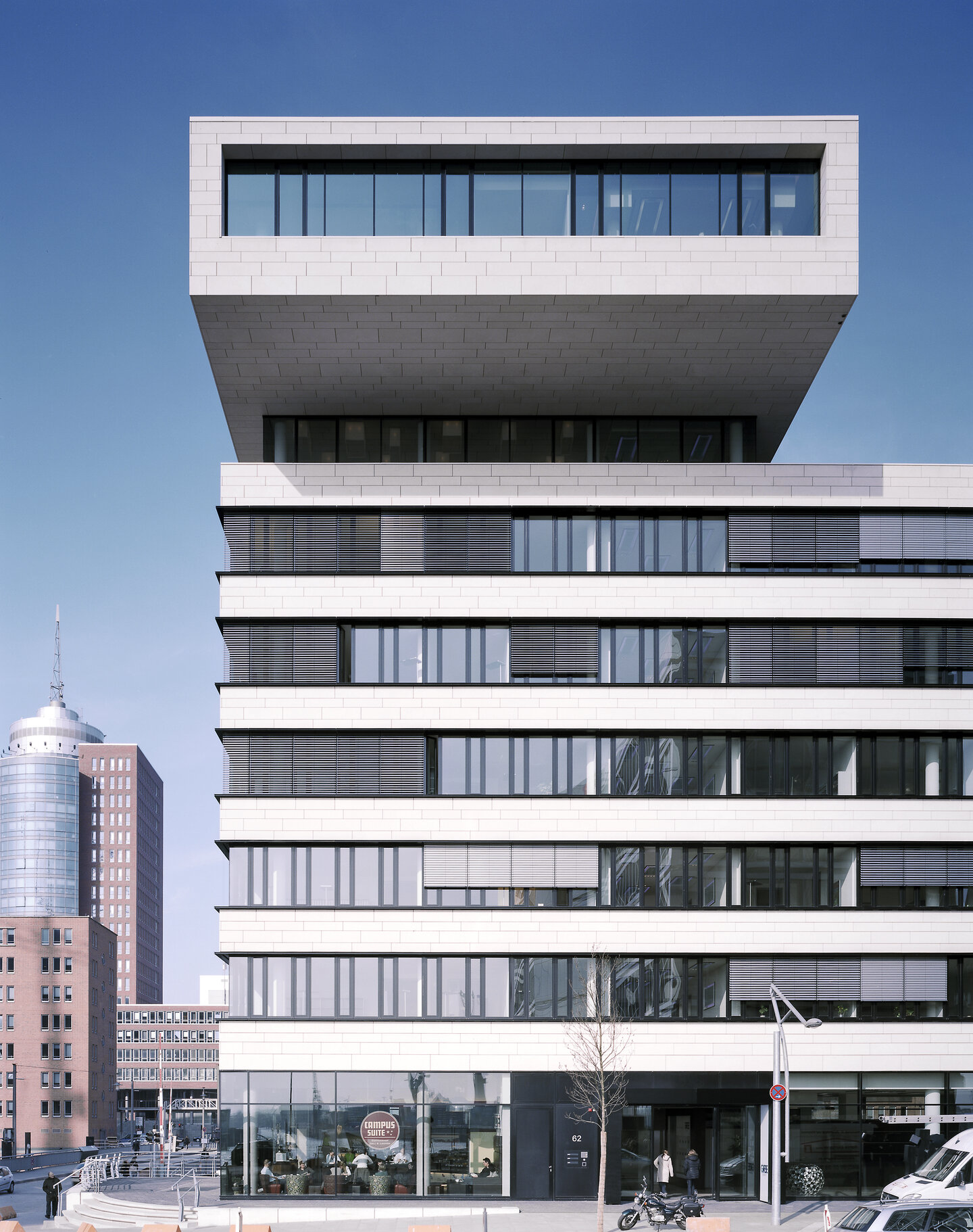 In der vorfinalen Fassung schwebt der Kopf des Hochhauses über dem Riegel, aus dem er sich entwickelt. Die Auskragung von sechs Geschossen über der Promenade am Dalmannkai beträgt 8 Meter.