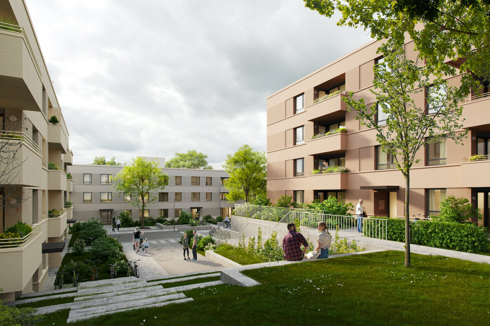 Die drei Solitäre bilden zusammen mit dem Bestand ein parkartiges Quartier, mit üppig angelegten Freiräumen (BWP Endreß Landschaftsarchitekten).