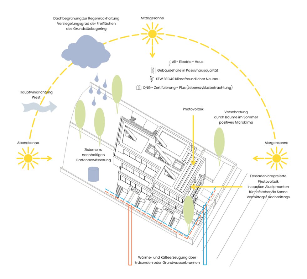 Das Gebäude weist auf Grund seiner energetischen und materialtechnischen Disposition eine positive CO2-Bilanz auf. Die Nutzung von Geothermie, wie auch großflächige PV-Anlagen auf den Dächern liefern regenerative Energie.