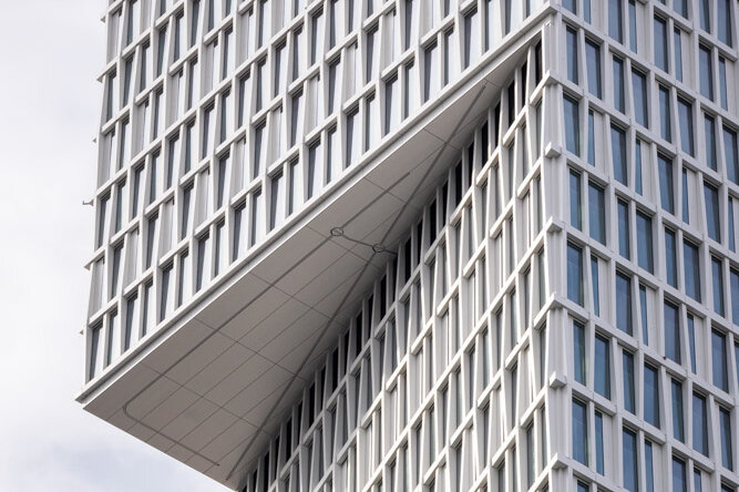In den letzten Wochen wurde die dreidimensionale Fassade des ONE nahezu final montiert (Ausführendes Unternehmen: FKN, Neuenstein). Auf ca. 18.000 qm Fassadenfläche wird nun das gewebeartige Spiel der vertikalen und horizontalen Lisenen besonders eindrucksvoll sichtbar.