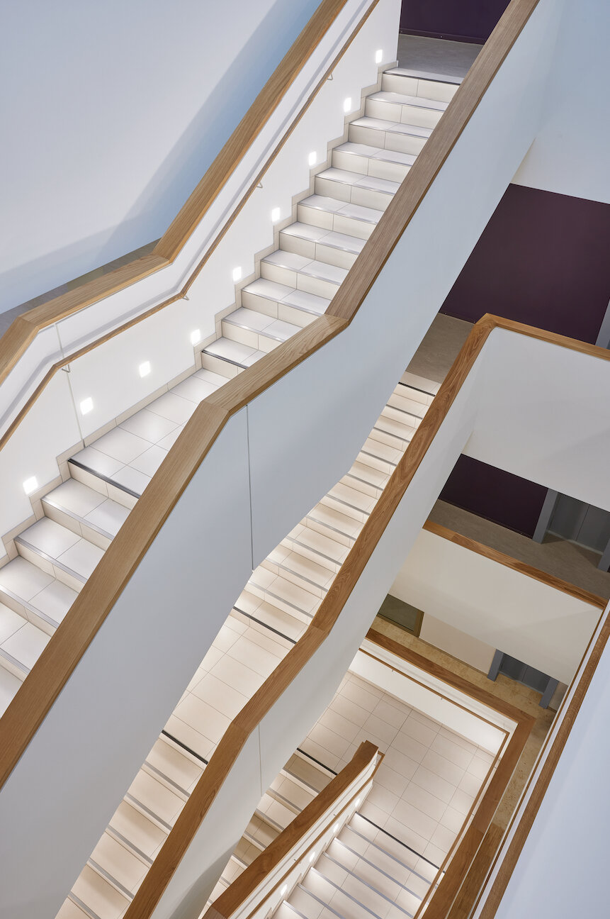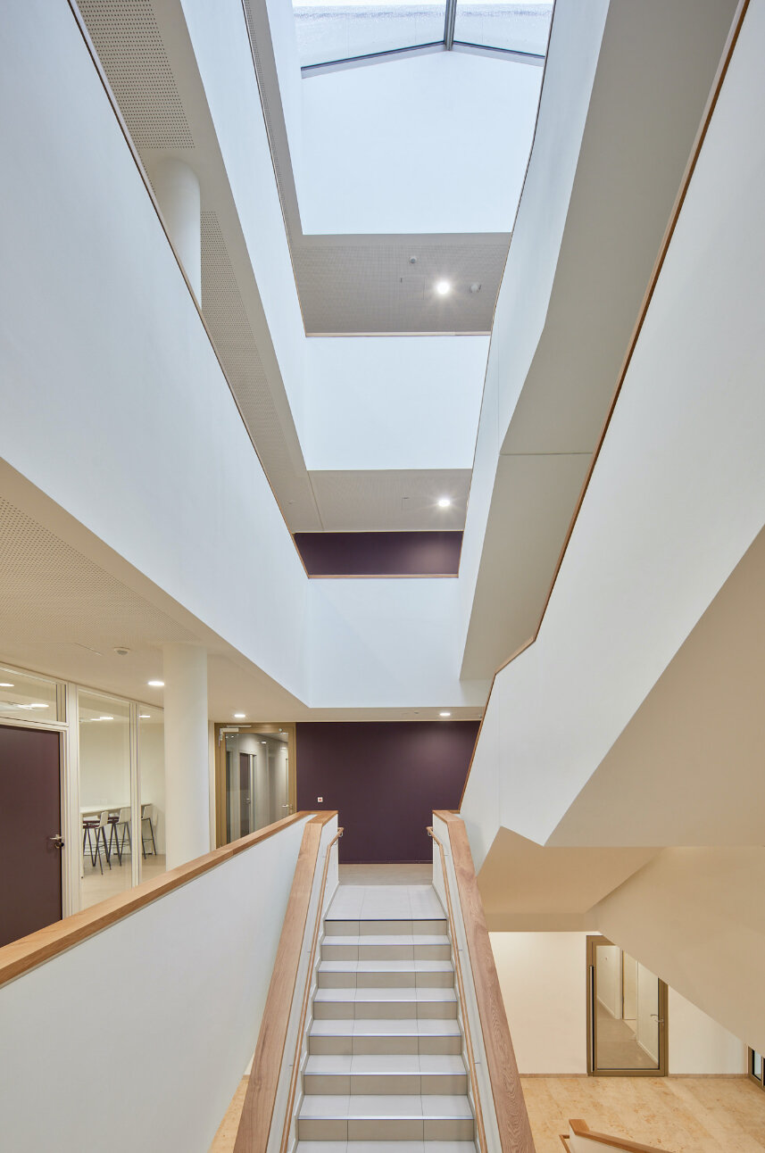 Die innere Struktur des Gebäudes ist von Offenheit und einer kommunikativen Mitte geprägt. Die mittig im Gebäude gelegene offene Treppenanlage ist Verteiler und kommunikativer Raum zugleich. An ihr gliedern sich verglaste Seminarräume und Terrassen an, die eine visuelle Verbindung auch über die Geschosse hinweg ermöglichen.
