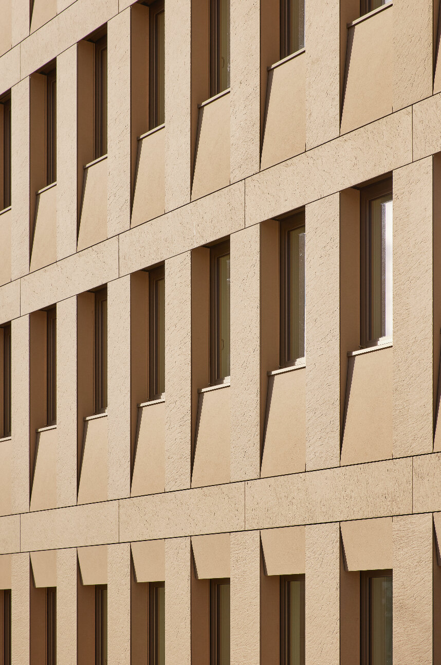 auf. Sämtliche dienende Räume sind im Mittelbund verortet - alle Aufenthaltsbereiche hingegen an der Fassade. Diese besteht aus Faserbetonelementen, welche eine eigens für dieses Projekt entwickelte Strukturierung erhalten hat. Die konisch angeschrägten Laibungen der Fenster betonen die Plastizität des Gebäudes.