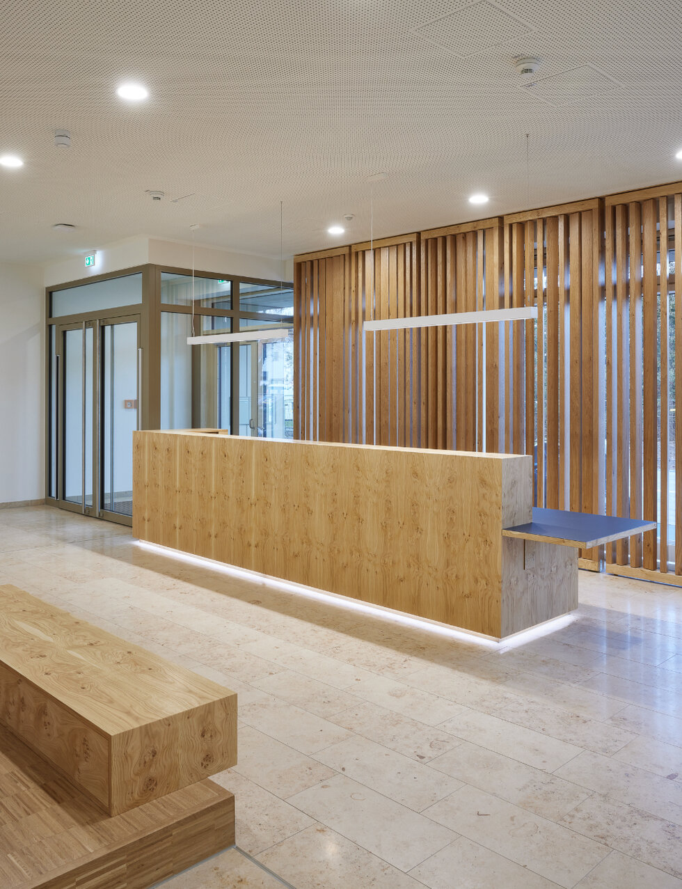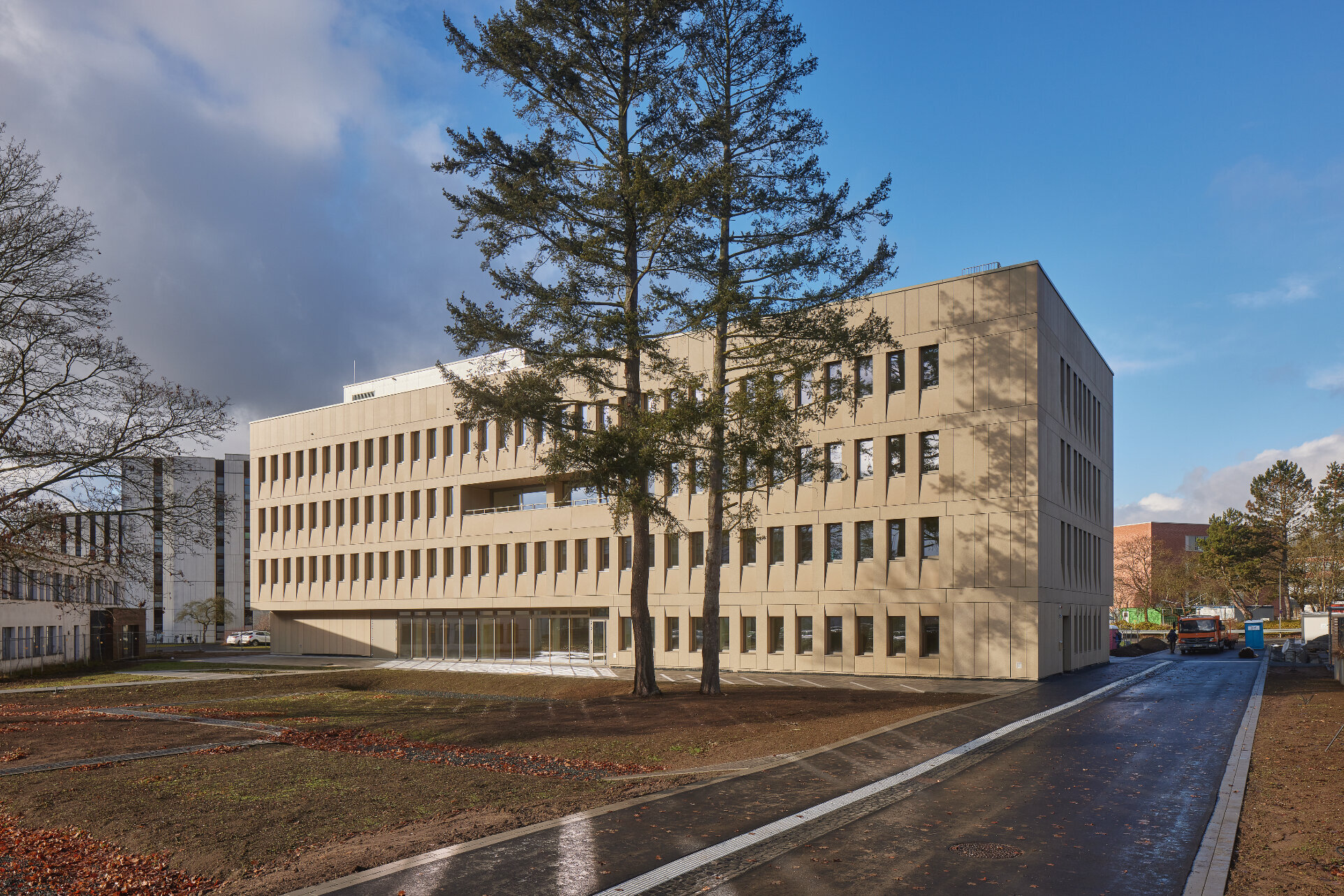 Der als Dreibund gegliederte kompakte Baukörper erfüllt sehr hohe Nachhaltigkeitsanforderungen und weist ein hervorragendes A/V-Verhältnis