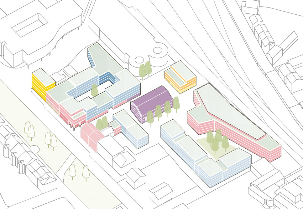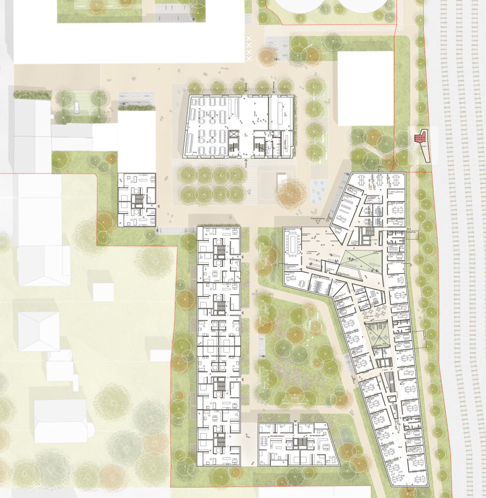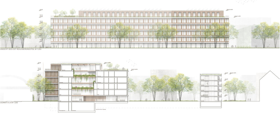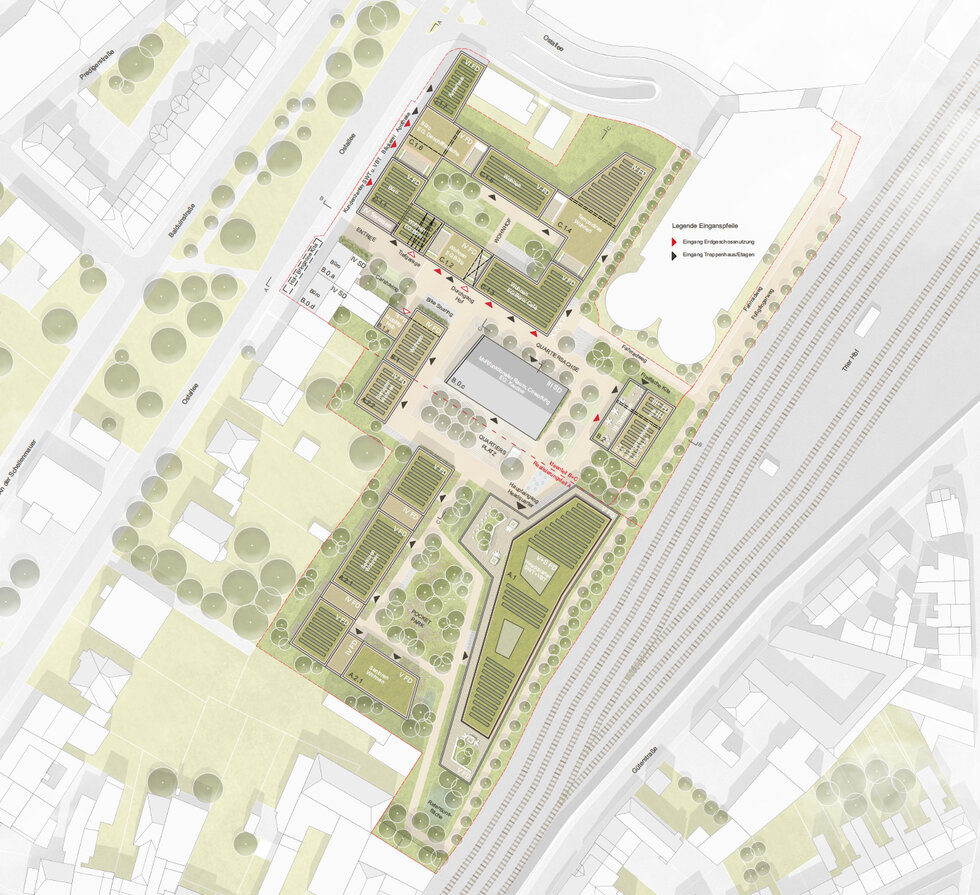 Im Binnenbereich wird der Altbau (Werkstattbau) erhalten und zu einem Tagungszentrum umgenutzt. Das Headquarter der beiden Unternehmen wird als raumbildender Riegel parallel zur Bahntrasse entwickelt.