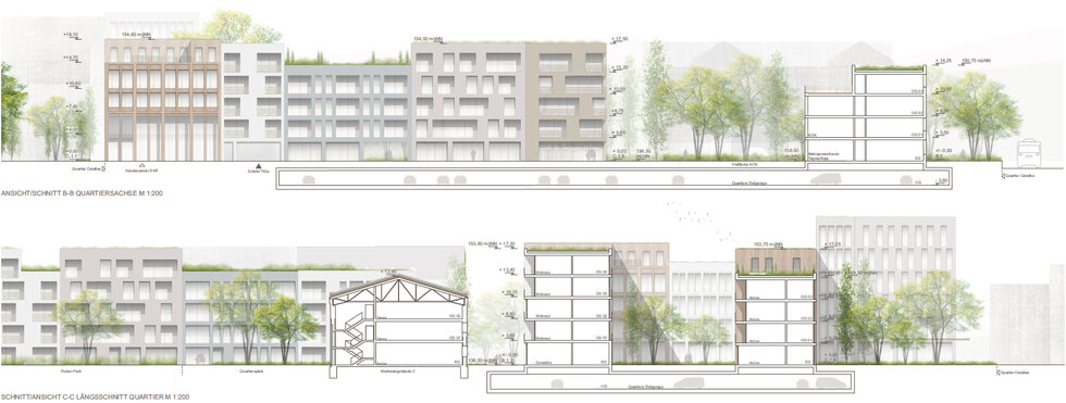 Dabei bestehen in Bezug auf die zeitlich-räumliche Verfügbarkeit vielfältige Restriktionen, die eine phasenweise Umsetzung erfordern. Entlang der Ostallee entsteht ein analog der historischen Parzellierung angepasster Strassenzug aus Stadthäusern mit Ausformulierung des Eingangs in die Quartiersmitte.