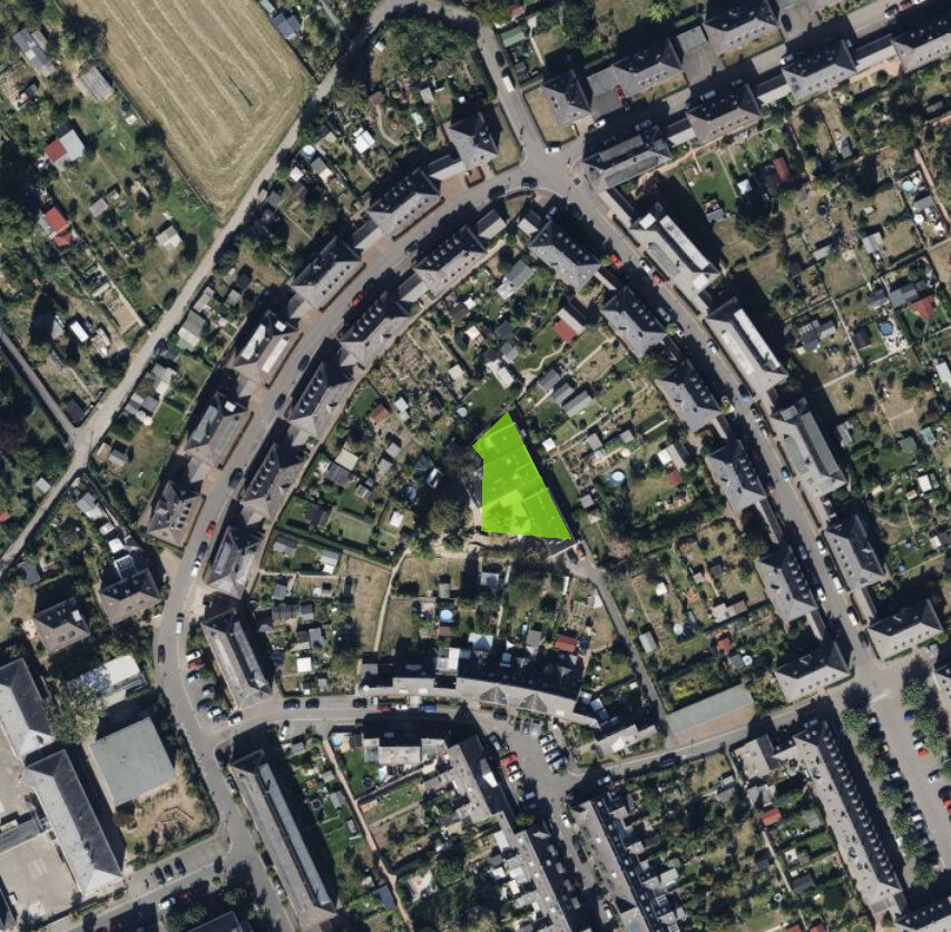 Der Neubau – der an ein überdimensionales Spielzeug erinnert – liegt als trapezförmige Figur zentral inmitten einer Umgebung aus Kleingärten. Die fünfte Ansicht mit der begrünten Dachfläche spielt mit der patchworkartigen Optik der Kleingärten, sodass ein homogenes Bild entsteht.