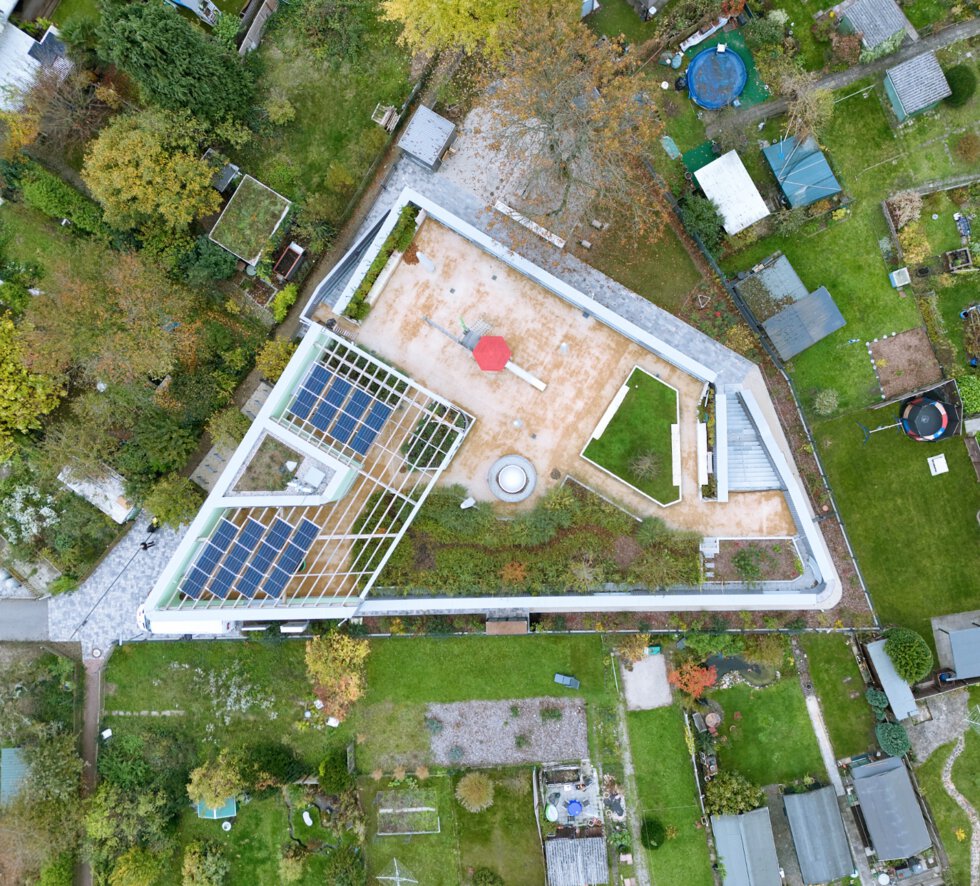 Es ist ein auf allen Ebenen benutzbares Gebäude entstanden, das die durch die erforderliche Bebauung „verlorene“ Grundstücksfläche auf dem Dach wieder zurückerobert.