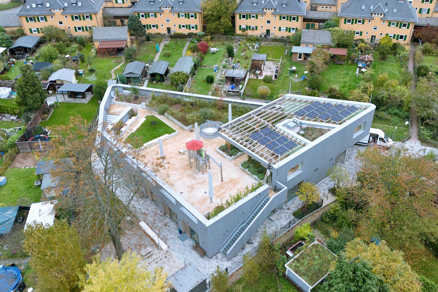 Auf Grund der beengten Grundstücksfläche wurde daher ein Konzept entwickelt, das einen Großteil der Spielfläche der KiTa auf dem Dach vorsieht. Über zwei Außentreppen ist diese mit den Spielflächen des Erdgeschosses verbunden.