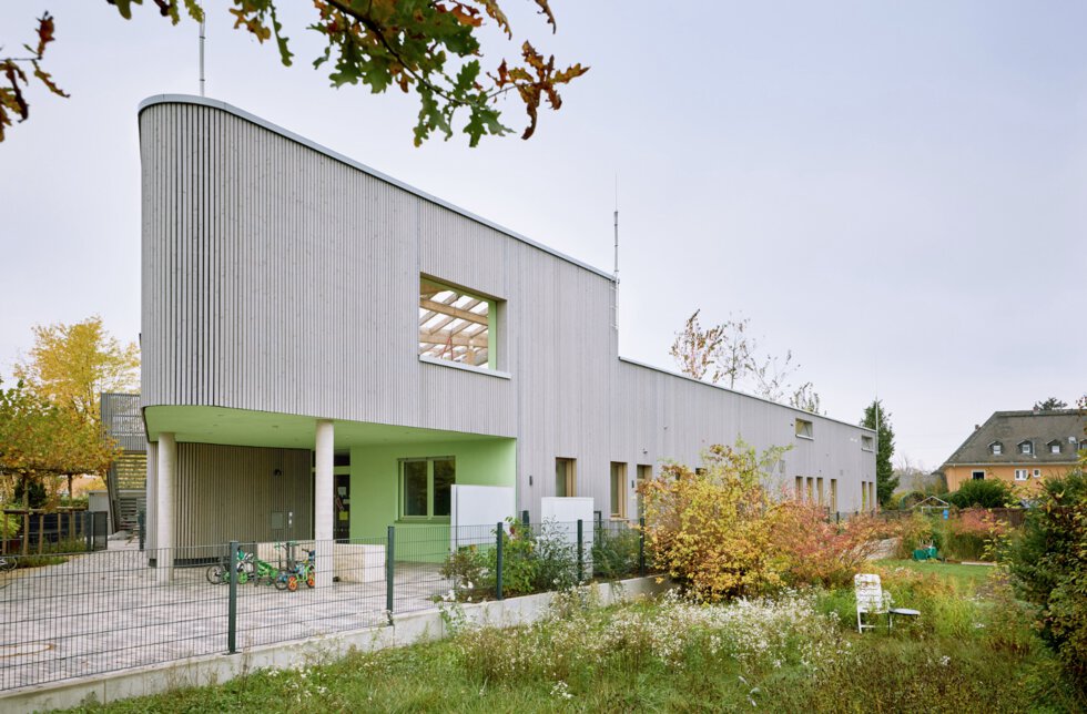 Die dreigruppige KiTa mit Mehrzweckraum und einer komplexen Freiraumstruktur musste auf beengte Grundstückverhältnisse und die denkmalgeschützte Umgebung der Eisenbahnersiedlung mit einem innovativen Konzept reagieren. Der Altbau, schadstoffbelastet und in maroder Verfassung, konnte nicht revitalisiert werden, sodass nur ein Neubau in Frage kam.