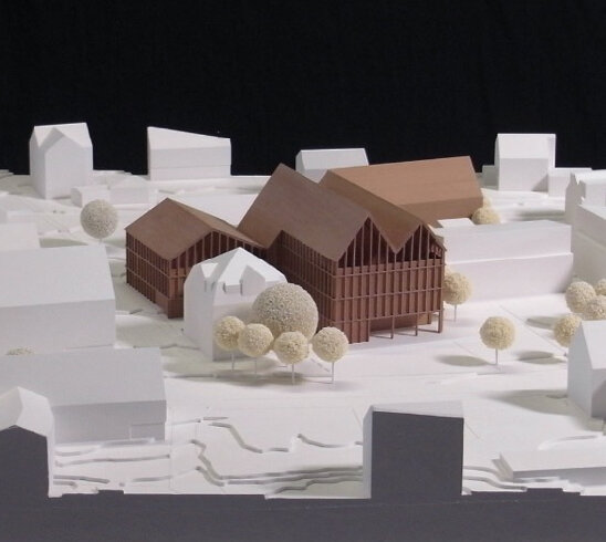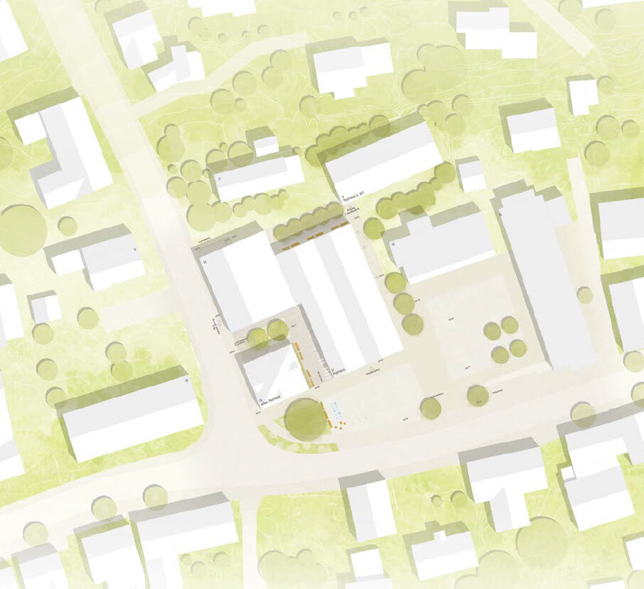Unser Beitrag sieht einen L-förmigen Baukörper mit gefalteter Dachlandschaft vor.