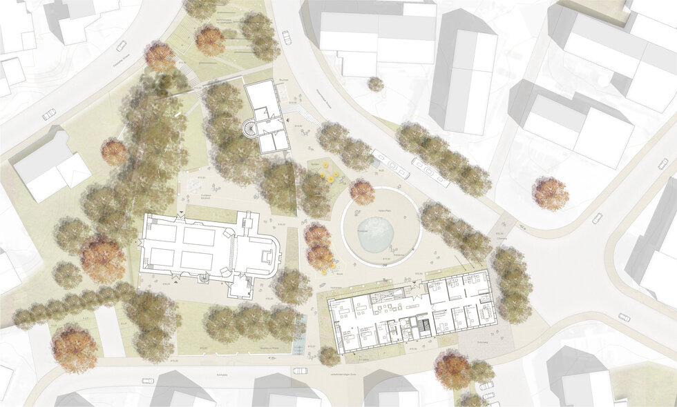 Die Freianlagen wurden gemeinsam mit Planstatt Senner, Überlingen konzipiert. Im Zentrum steht eine der an diesem Ort ehemals vorfindlichen, historischen „Hüle“ (ein Teich zur Viehtränke) nachempfundene, kreisrunde Wasseranlage.
