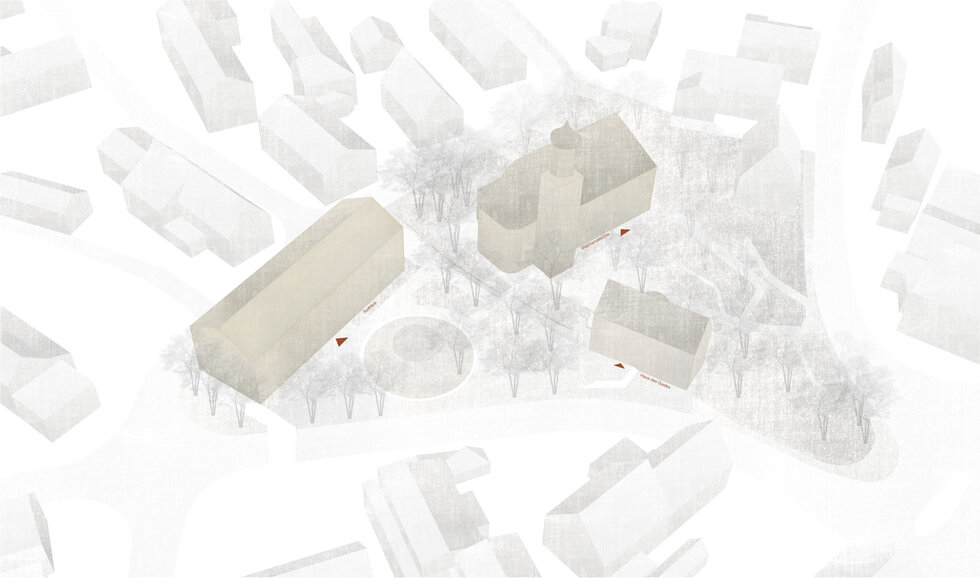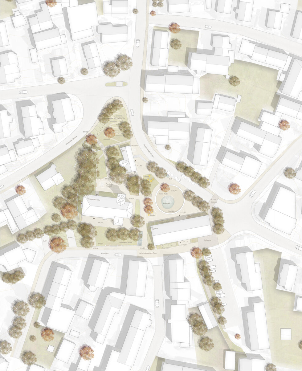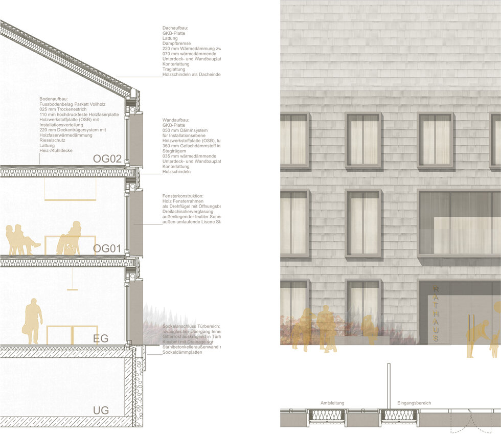 Ortstypische Gestaltungsweisen, wie einfache Geometrien (Langhaus), Satteldächer und eine naturnahe Materialität der Fassade (Holzschindeln) prägen das Konzept.