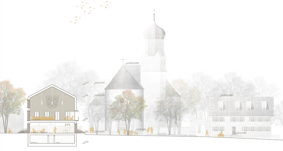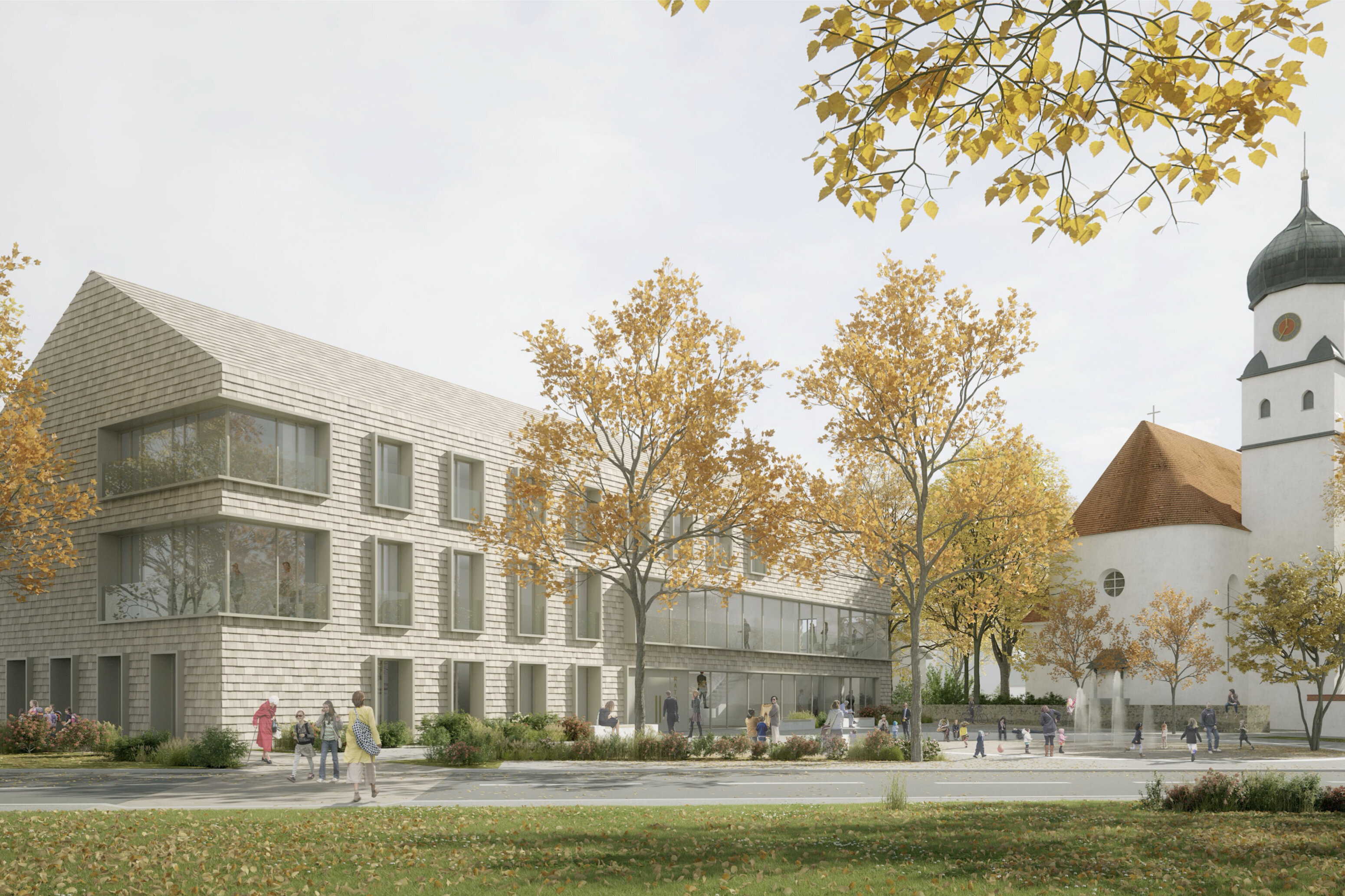Bei der Gestaltung der Ortsmitte und des Rathauses in Westerheim, haben wir besonderen Wert auf eine sensible Einfügung des Neubaus in ein intaktes Ensemble aus Kirche und Haus des Gastes gelegt.