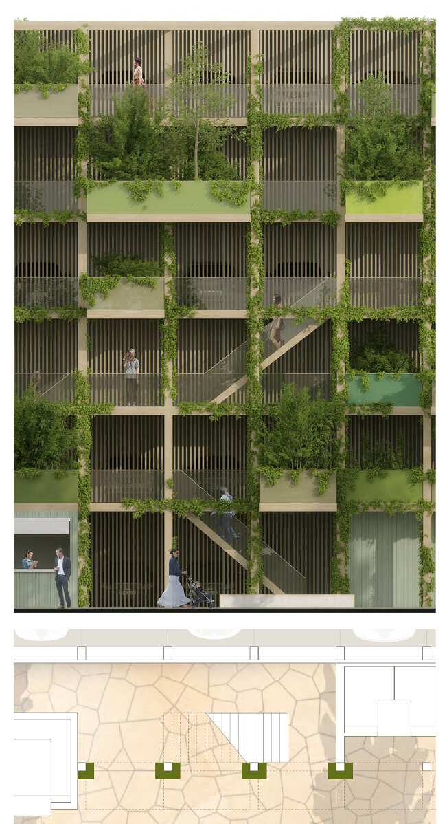 Das Konzept bestehend aus zwei, einen Platz bildenden, Baukörpern wird aus zertifizierter Baubuche konstruiert. Das dem HUB vorgelagerte „Green Rack“ ist ein multifunktionales urbanes Tool, das vielfältige Nutzungen integriert.