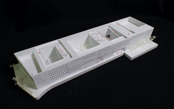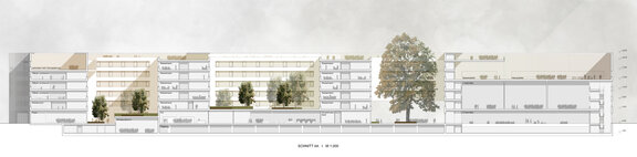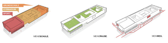 Das Konzept sieht einen stringenten Baukörper mit einer differenzierten Hoftypologie vor. Die Bünde der Klassenräume tragen auf Terrassen und Dachflächen Freiraumnutzungen und Pausenbereiche, welche jeweils den unterschiedlichen Altersklassen und Schulformen zugeordnet sind.