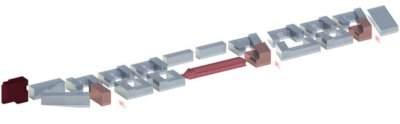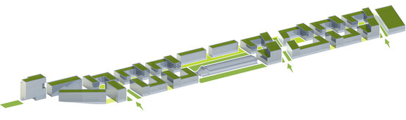 Die Orientierung der Nutzungen weist auf Grund der Lärmemissionen der Umgebung nach innen. Es entstehen halböffentlich und öffentlich genutzte Bereiche um einen umgenutzten Bestandsbau (Güterhalle) des ehem. Güterbahnhofs im Zentrum des Quartiers.