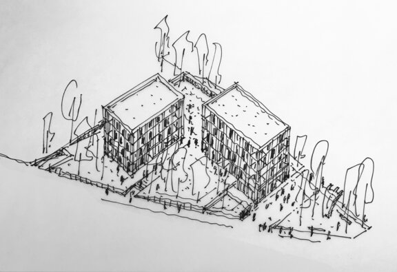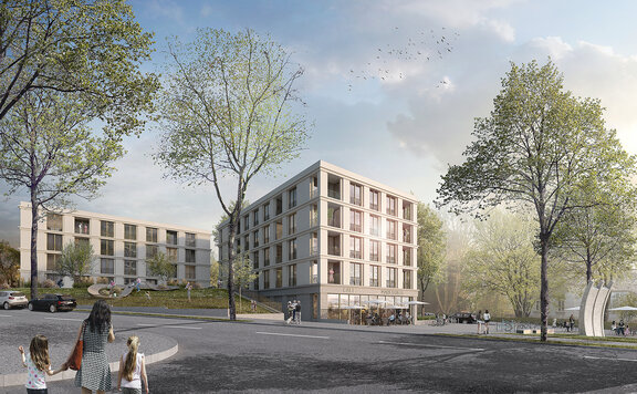 Die Neubauten der Villen kulminieren in der nördlichen Spitze des Areals, auf welchem studentisches altengerechtes Wohnen sowie eine Einzelhandelsnutzung vorgesehen sind.