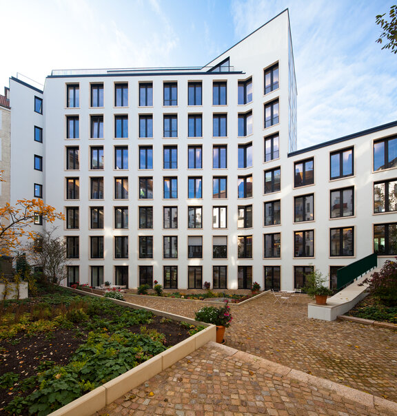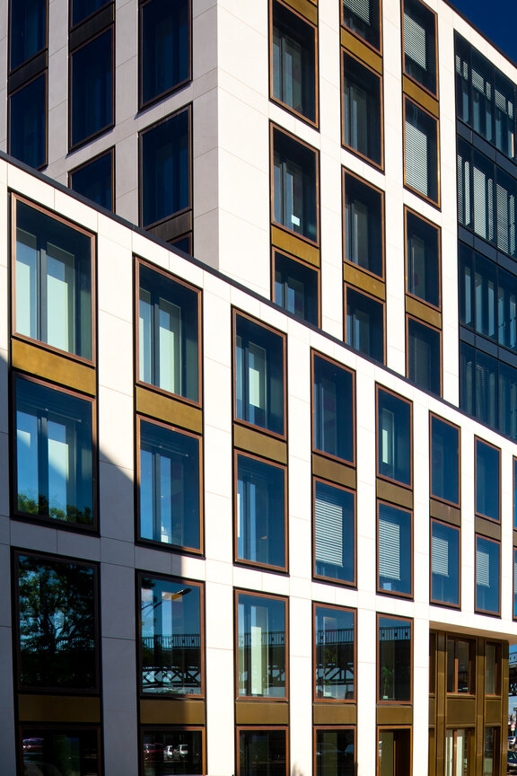 Das dreibündige Gebäude erhielt aus schalltechnischen Gründen (Hochbahn) eine Doppelfassade zur Elbseite. Sie besteht aus zwei Hauptmaterialien; einem nahezu weißen Kalkstein „Magny de Louvre“ und einer zweigeschossigen Fensteranordnung aus vorbrünierter Baubronze. Die äußerst hochwertige Anmutung der Materialien entspricht der Haltung des Traditionshauses.