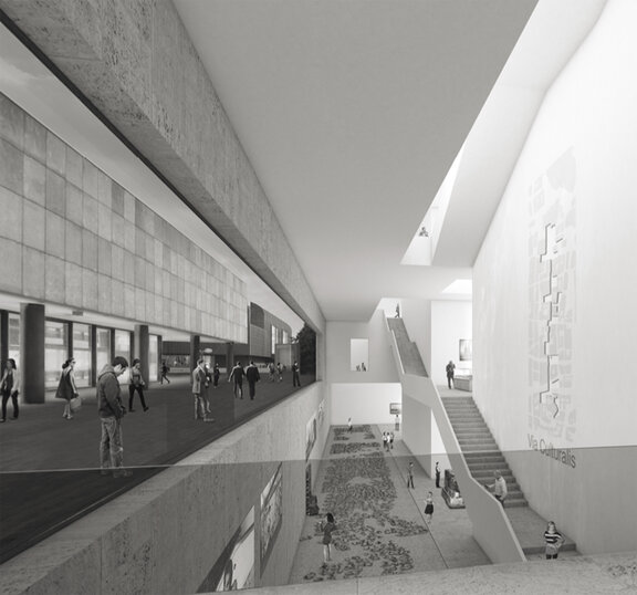 Das gemeinsam mit cba, Luxembourg erarbeitete Konzept sieht einen blockartigen, mit Gliederungen rhythmisierten Baukörper vor, der sich an die bestehende Rhythmik der Strassen- und Platzfigur anlehnt. Blickbezüge vor allem aus dem musealen Teil des Gebäudes in die Umgebung prägen die