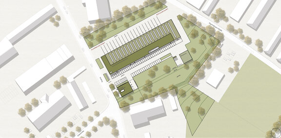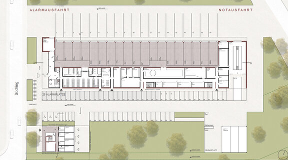 Das langgestreckte Gebäude ist auf kurze Wege ausgelegt und komprimiert die Einsatzbereiche in einem kompakten, zweigeschossigen Baukörper. Direkte Wege von den Alarmparkplätzen zum Einsatzfahrzeug kennzeichnen den Grundriss. Der Schulungsbereich im Obergeschoss ist über ein separates Foyer erschließbar und hat Sichtkontakt zur Fahrzeughalle.