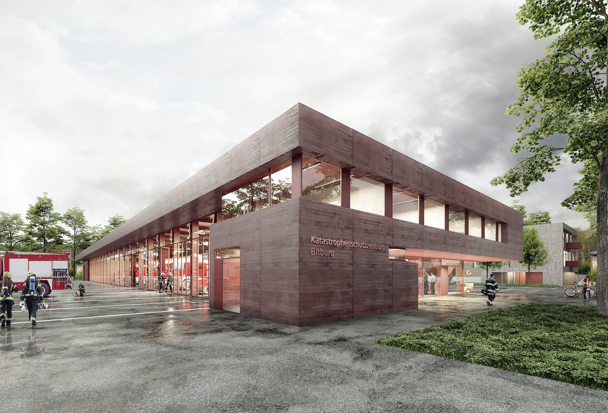 Der Neubau des Katastophenschutzzentrums in Bitburg umfasst alle wesentlichen Komponenten eines modernen Rettungszentrums. Neben der Fahrzeughalle für 24 Einsatzfahrzeuge bietet das Zentrum einen Schulungsbereich und Räumlichkeiten für städtische Einrichtungen.