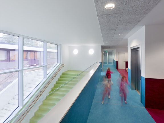 Im Kontrast zum in Naturtönen gehaltenen Außenbereich, wurden im Innenraum kräftige Farben zur Differenzierung der unterschiedlichen Nutzungen gewählt. Die KiTa bietet dort Räume für U3 und Ü3 – Gruppen, sowie einen Mehrzwecksaal.
