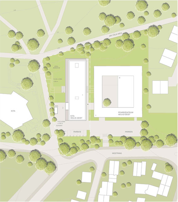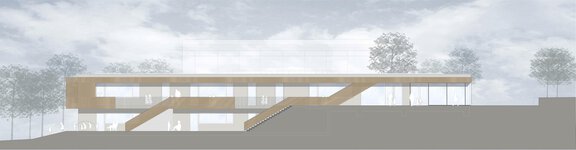 Der Neubau der Kindertagesstätte setzt sich als eigenständiger Baukörper neben das bestehende Gemeindezentrum. Mit seiner markanten horizontal gegliederten Ansichtsfigur aus unbehandelten Lärchenholzelementen fügt es sich in die Topographie in selbstverständlicher Weise ein.