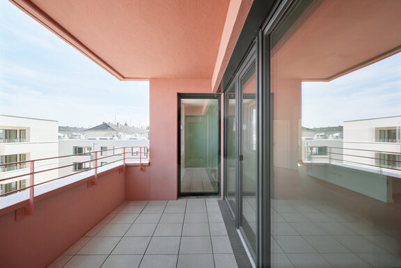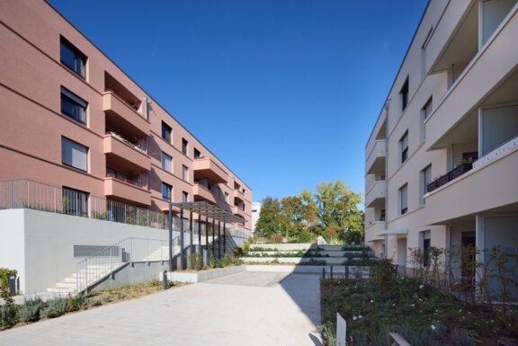 Die Hofanlage überwindet einen Geländesprung von ca. drei Metern. Dadurch entsteht der öffentlichere, dem Wingertsgrund zugewandte Erschließungshof, der die Feuerwehrzufahrt, Car-Sharing-Stellplätze und Fahrradabstellplätze zulässt, sowie durch eine kleine Platzfläche mit Spielgelegenheiten belebt wird.