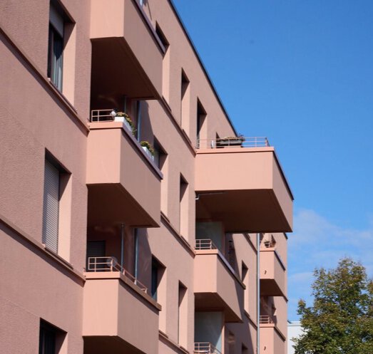 Durch die gewählte Farbgebung wird ein Bezug zur gründerzeitlichen Bestandsbebauung hergestellt. Die typischen Sandsteintöne finden sich in der Fassadengestaltung der drei Neubauten wieder. Jedes Gebäude erhält eine eigene „Wagenfarbe“ (rötlich, golden/gelb, grau). Die farblichen Absätze ergeben sich durch die unterschiedlichen Putzstrukturen und Versprünge in der Oberfläche.