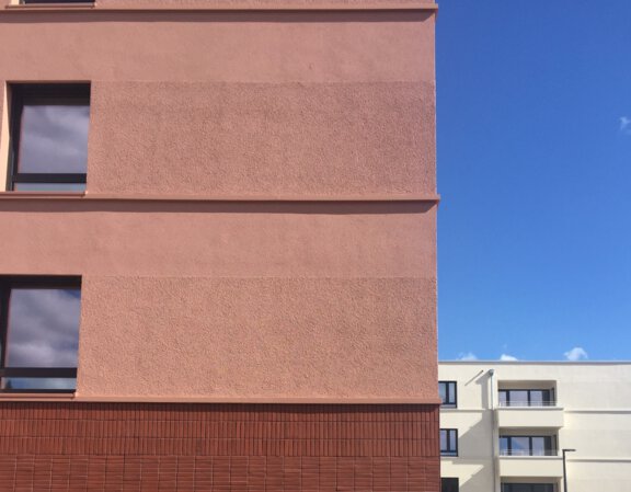 Die Gebäude erhalten jeweils einen Fliesensockel in Hausfarbe. Die Schmalformate sollen senkrecht und mit Kreuzfugen-Verband zum Einsatz kommen.
