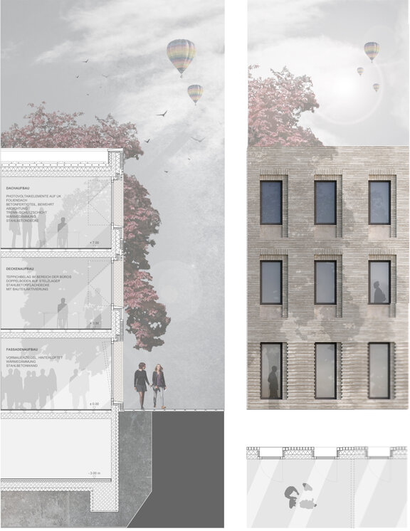 Das Konzept greift hierzu die den Ort prägende Baustruktur, aus mehrheitlich in Nord-Süd-Richtung verlaufenden zeilenartigen Bauten, als Hauptausrichtung der Neubauten des 1. und 2. Bauabschnitts auf. Die quartiersprägende Solitärbebauung mit locker auf den Grundstücken und mit deutlichem Abstand zur Straße stehenden Bauten, wird auch bei dem Neubau fortgesetzt. Da die, durch Zeilen geprägte, Struktur jedoch aktuell keine raumbildende Qualität entfaltet, diese jedoch in Bezug auf die Bildung eines Ortes, eines Schwerpunkts geradezu unerlässlich ist, wird ein Bautyp gewählt, der in der Lage ist eine Mitte zu definieren: ein offener Hoftyp.