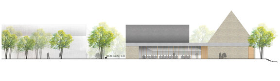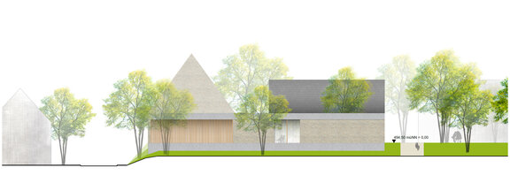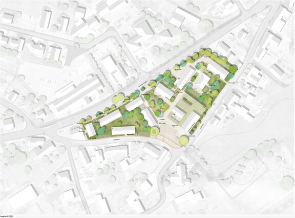 Die Freiraumplanung sieht einen thematisch zweigeteilten Dorfplatz vor, der sich in einen intensiv begrünten Teil und eine weitgehend befestigten Teil für Festveranstaltungen gliedert.
