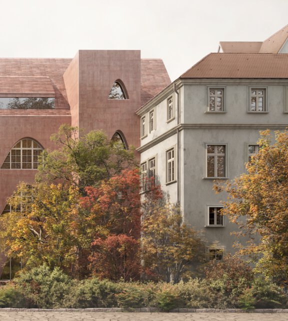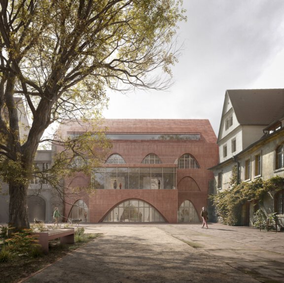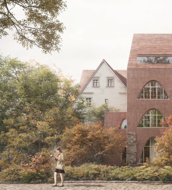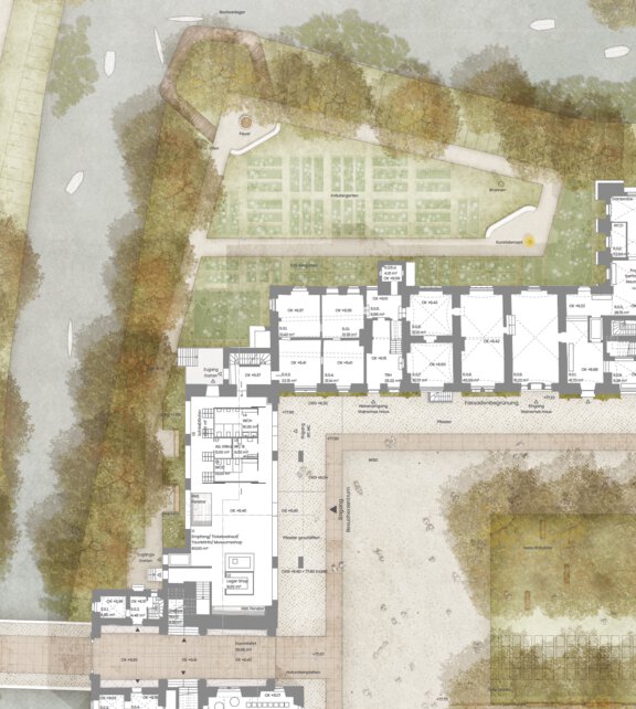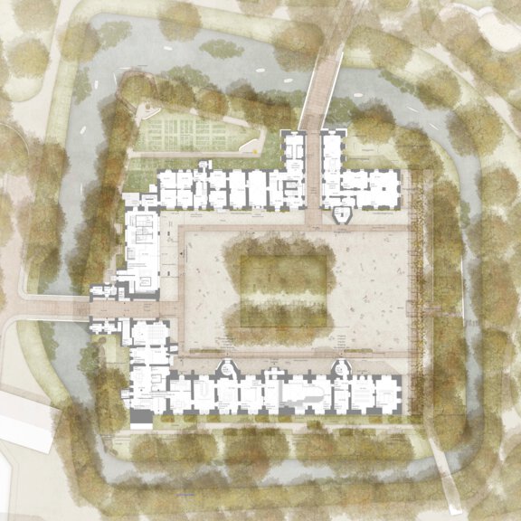 Für das Gesamtareal wurde ein Konzept entwickelt, welches ein behutsames Ergänzen und Weiterbauen ermöglicht. Alle wesentlichen denkmalrelevanten Teile des Bestands bleiben erhalten. Der Schlosshof wird reaktiviert und durch großkronige Bäume ergänzt.