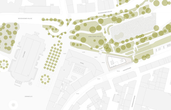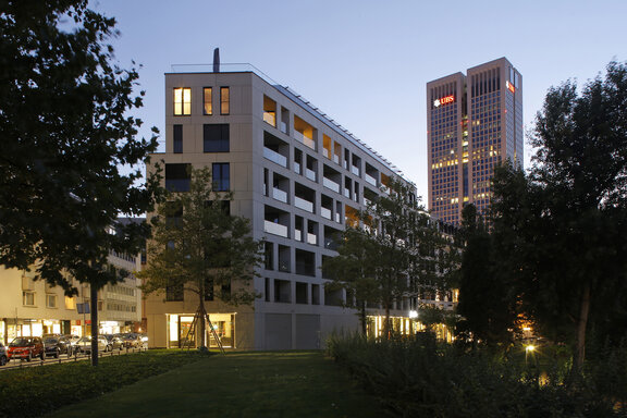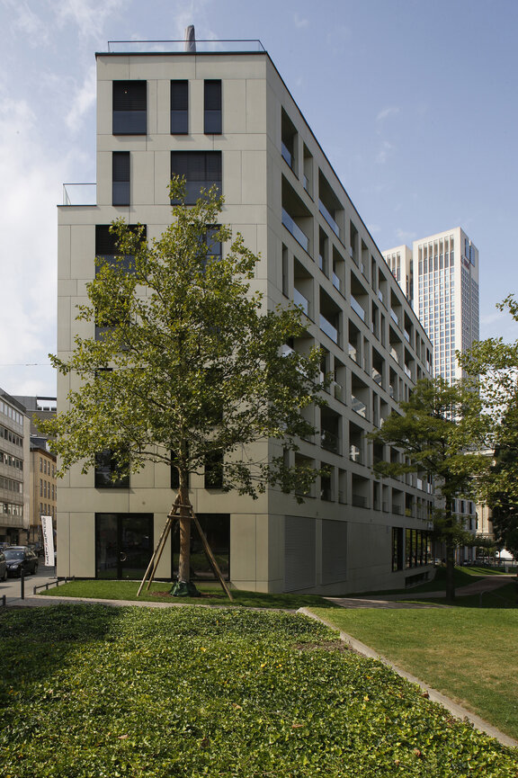 Die Fassade des Gebäudes nimmt in der Farbigkeit und Beschaffenheit der Oberfläche Bezug zum für das „Opernquartier” typischen Travertin-Ton. Gleichwohl ist es als selbstbewusster Stadtbaustein der Gegenwart als Sichtbetonfassade konzipiert.