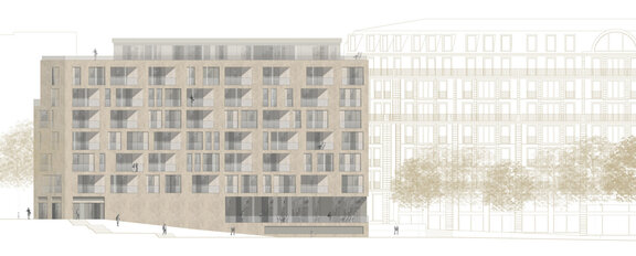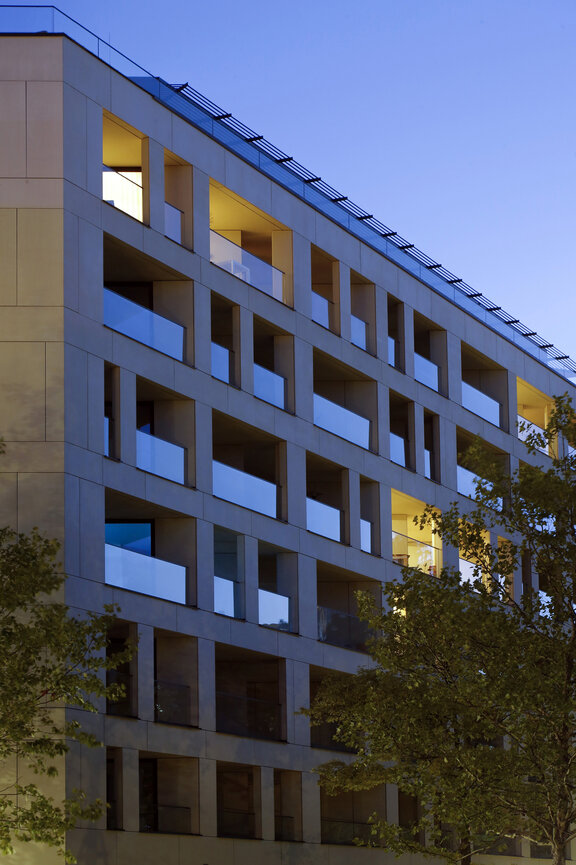 Sämtliche Untersichten der Loggien sind ebenfalls verkleidet, sodass ein monolithischer Gesamteindruck des Gebäudes entsteht.