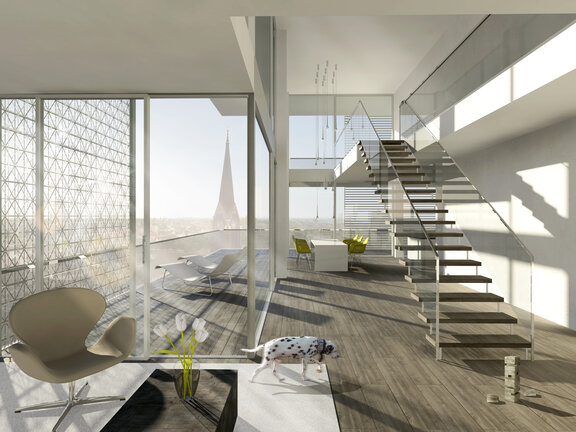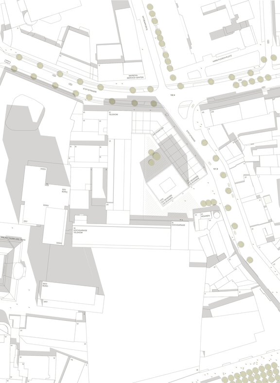 Auf dem ehemaligen Telekomareal an der Stiftstrasse sieht das Konzept einen 30-geschossigen Wohnturm im Ensemble mit einem Büro- und Gewerberiegel vor. Sie bilden einen Binnenhof sowie im Dialog mit dem Bestandsbau einen Auftaktplatz an der Stiftstrasse. Zum Schutze der umgebenden Bebauung wurde die Hochhausentwicklung in den Binnenteil des Grundstücks verlagert.